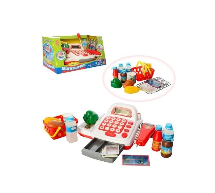 Каса має багато функцій, за допомогою яких можна обслуговувати покупців у грі і рахувати гроші. До набору включено монетки і банкноти з паперу, а також кредитка - Все як у дорослих. Каса відкривається і всі грошоміни можна покласти туди, причому, закривши під ключі, якщо потрібно. Біля касового апарату є весы. Граючи в ролеву гру і зважуючи продукти, малюк Взнає про вагу і одиниці його виміру. До комплекту входить кошик з продуктами: овочами, фруктами, пляшками та різними упаковками. Завдяки сканеру дитина зможе зчитувати товари, які допоможуть їй відчути себе справжнім касиром. Перегляд мікрофонЩоб робити оголошення як у великому супермаркеті. Граючи в азартні ігри самостійно або з друзями, дитина розвиває Фантазію, вміння спілкуватися, уважність і дружелюбність.