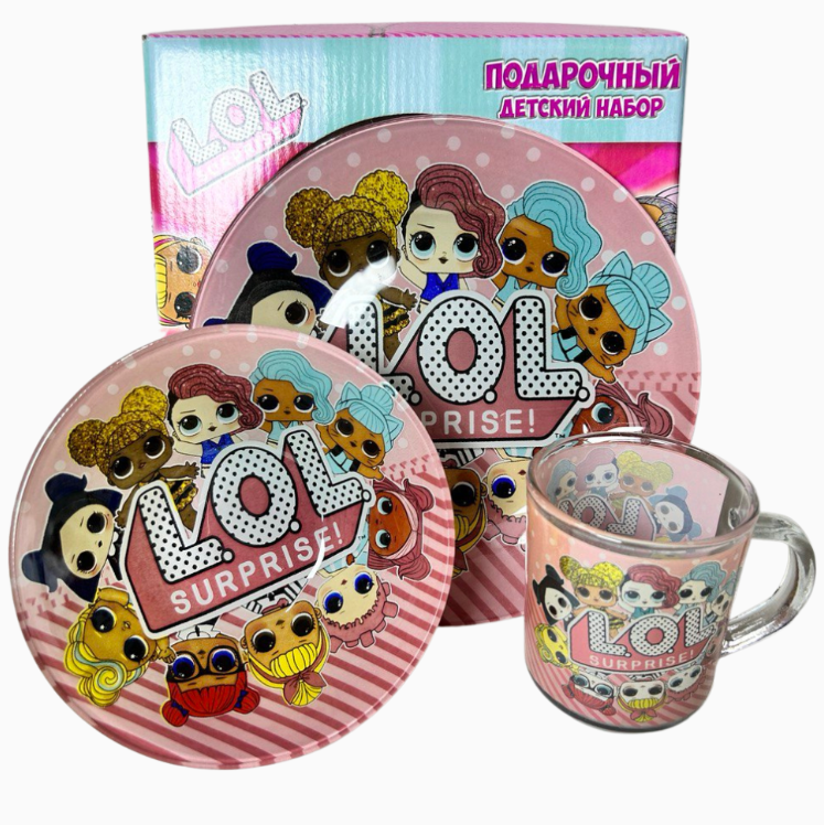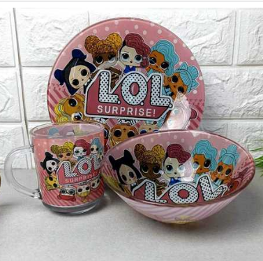 Набір дитячого посуду виготовлений з міцного органічного скла. Термонаклейка з героями мультфільму Лол (Lol) Surprise нанесена із зовнішнього боку виробу та неодмінно зацікавить і сподобається вашій дитині.
